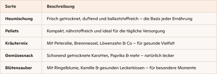 🌿 Kräuter- & Heumischungen: Schonend getrocknet, voller Aroma und ideal für die Verdauung.